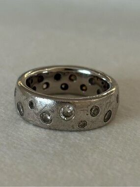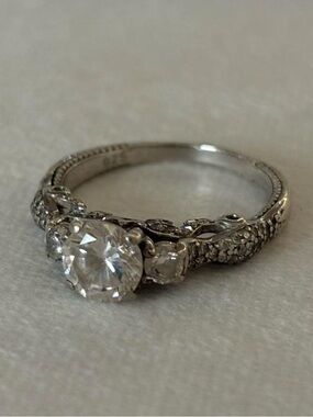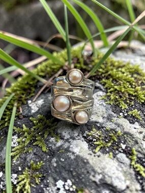 Elegant pale pink opal ring, Features a soft pink center Opal set in a detailed 14 k white gold plated, silver 925 stamped band with hand painted gold sort of leaf. Stylish, feminine design perfect for everyday wear or special occasions. Some wear on band. Looks good, complements are guaranteed.