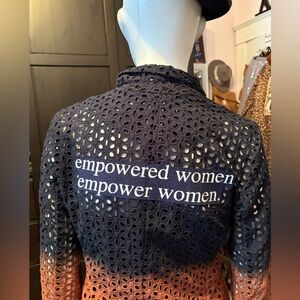 The bottom half has been bleached dipped to create another color, and a patch was added on the back, which says “ empowered, women, empower women”