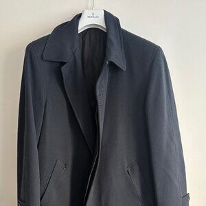 A navy blue car coat made in Italy for Harry Rosen, The fabric is a wool twill, a dark navy Loro Piana Storm System Wool. Features 2 waist pockets with an additional zippered pocket on each and two zippered inner pockets. It is lightly quilted, and features a button closure with a hidden placket.