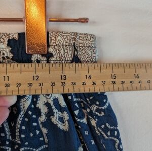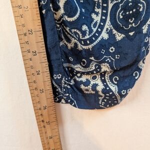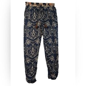 Elegant pants with intricate navy and beige patterns. Perfect for any occasion.