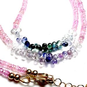 Wear as a long necklace or wrap 4ร around the wrist for a layered bracelet look (please measure wrist for wrapped wear). Soft blues and pinks shimmer beautifully with moonstone and Herkimer sparkle.