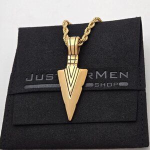 This 14K Gold Plated arrowhead pendant is crafted from high-quality stainless steel and is a striking piece that blends rugged style with personal significance. The arrowhead design symbolizes strength, protection and direction, making it a meaningful accessory for men. It has a smooth, polished surface on back side.