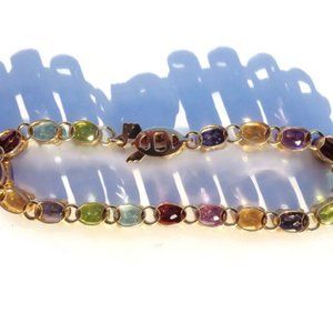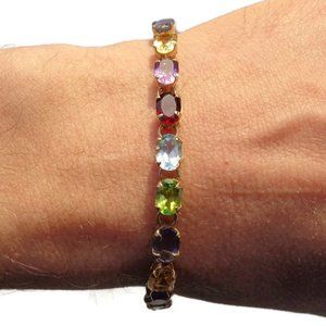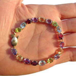 The bracelet is stamped 14K yellow gold and contains 18 oval mixed cut natural colored gemstones -
