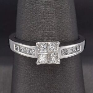 In new condition gorgeous engagement ring! A quartet of elegant princess-cut diamonds invisibly set sparkle in the centre of this dramatic ring. Four princess-cut diamonds dance on each side of the centre for added allure.