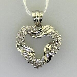 This exquisite pendant showcases a beautiful heart design adorned with a luxurious mix of round and baguette diamonds. The combination of cuts creates a stunning contrast, adding sparkle and sophistication to the 14K white gold setting.