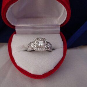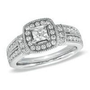 This beautiful halo design diamond engagement/wedding 14K white gold style features a distinctively vintage design. At the center, a 3/8 ct. princess-cut diamond sparkles in a squared frame set with 60 round brilliant cut accent diamonds. A diamond collar flanks the frame, while the ring's shank boasts a double row of diamonds. Intricate milgrain detailing gives the ring depth and dimension. Boasting a thoughtful 1 ct. t.w. of diamonds and a polished luster, this ring is a beautiful beginning to a lifetime of love.