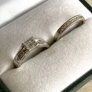 Beautiful bridal set consisting of 14K white gold diamond engagement ring and matching diamond wedding band.