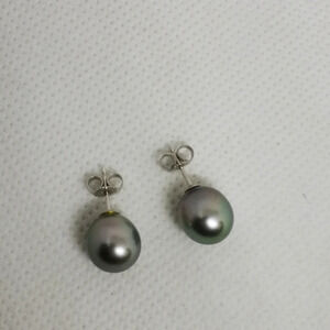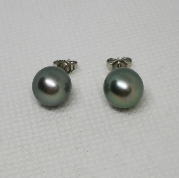 Large authentic gray/black Tahitian pearls with green and pink hues. 14k / 585 studs and backings white gold.