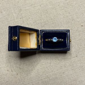 Cute little blue CZ set in shiny white gold plated metal. Minimalist and perfect for stacking. The CZ has a very interesting cut to it. Catches the light beautifully!