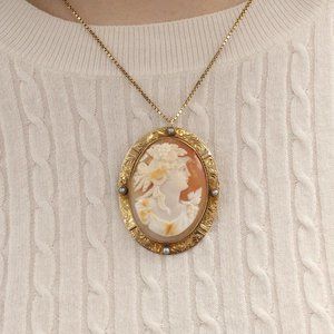 An antique Victorian Etruscan Revival cameo brooch/pendant. This piece features a hand carved shell cameo depicting a Bacchante, a female follower of the Roman God Bacchus (In Greek mythology they are knows as Maenads and Bacchus is known as Dionysus). Bacchus is the God of the grape harvest, wine and wine making, and Bacchantes are usually depicted adorned with grapes and grape leaves.This cameo shows a woman with grapes in her hair and on her dress, and has a beautiful creamy colour and natural orange flecks, and the background is a glossy orange that fades into white. The frame is 14k yellow gold with an engraved scrolling design and is accented with 4 bezel set natural grey pearls. The piece can be worn as a brooch or pendant.