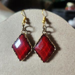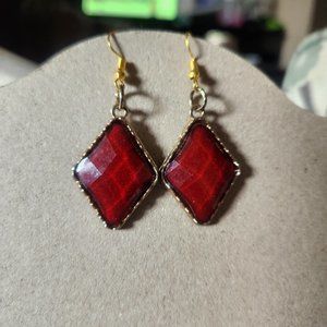 1.5" Gold Tone Hook Red Diamond Shape Dangle Earrings