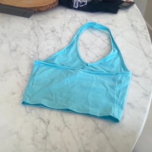 this light blue V-neck halter top in sizes small from H&M. the material is Cotton.