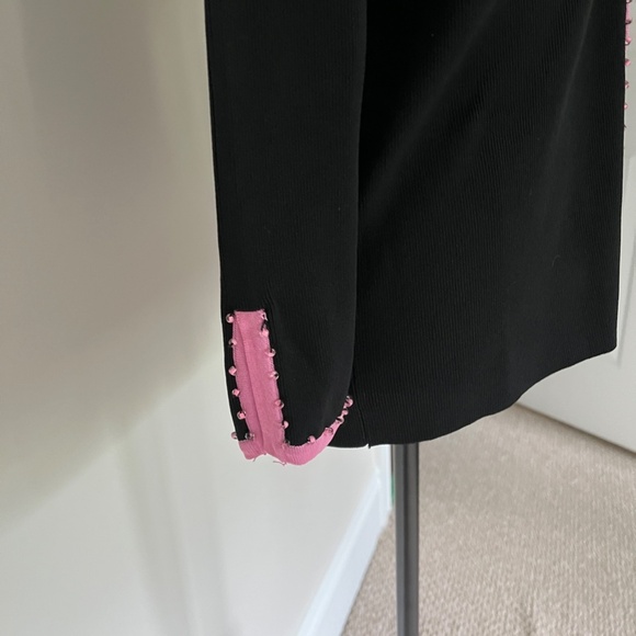 Vintage elegant looking black cardigan with bright pink edge by Finity. Buttoned down front and has a Collar also edged in pink but no beading. The collar is a little stretched but does flatten out better when its on and still looks really nice ( see in pic) .