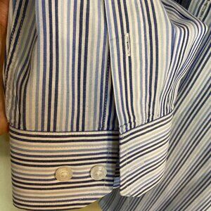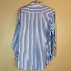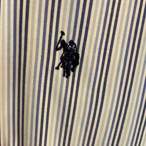 This U.S. Polo Assn. dress shirt features a classic blue striped design with 7 buttons down the front and button cuffs. It includes the iconic polo logo in navy blue on the chest. Wrinkle-resistant and crafted with designer quality, this size 17 34/35 shirt is both stylish and practical.