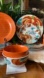 This set is in excellent condition/good; no chips, cracks, repairs, crazing, staining, etc. the pumpkin dishes show extremely little to no wear, however there are minor manufacturing flaws, and the orange dishes have signs of use, as seen