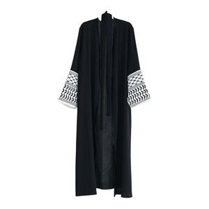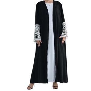 Elegant black long open robe with white embroidered patterned sleeves. Perfect for layering.