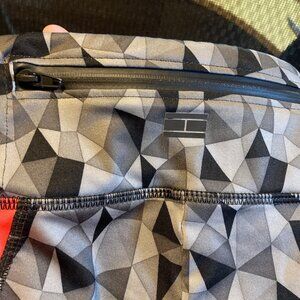 Stylish and high-quality capri-length leggings featuring a bold geometric print in black, grey tones, and a hot pink stripe down each leg. Measures approximately 27" inches length and a13 inch waist, made from a comfy polyester-elastane blend. Great brand, great fit, and in great condition! Made in Cambodia.