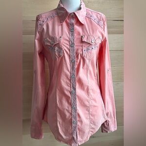 16-Grace in La long size S, long sleeve snap up embroidered pink-peach/white top