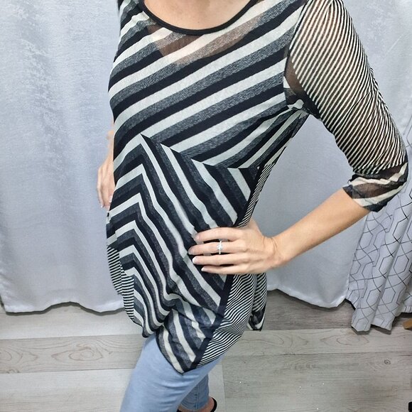 Item 17– The Bold Mod Semi Sheer Long Sleeve Tunic: Papa Vancouver Avant-garde Asymmetrical Striped Geometric, Size S