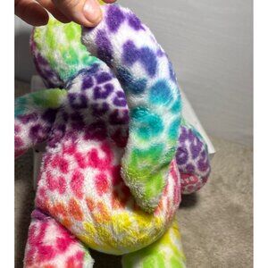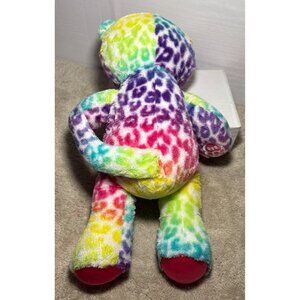 This adorable 17" Build A Bear plush features a vibrant rainbow tie dye leopard kitty design. Soft and cuddly, it's perfect for both playtime and decoration, making it a delightful addition to any stuffed animal collection.