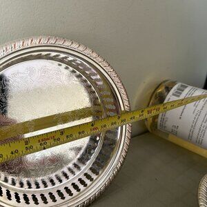Two shown in main photo but there are 17 of these beauties. Perfect for caterers, special occasions or upcoming celebrations. Features an intricate pierced detail around the border and the internal base has beautiful engraved scroll patterning.