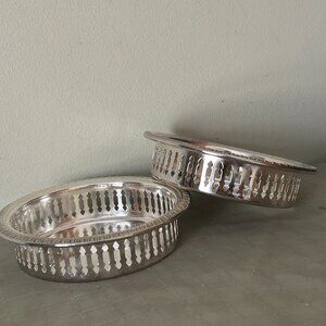 Great addition to your next dinner party table. Each coaster is approx. 5.5 inches in diameter (approx. 4.5 inches inside). There are minor tarnish and small pits but overall in good condition.
