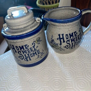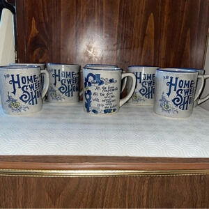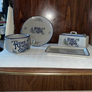 One bio gave a crack down the side and that’s the one with the quote on it it’s the only one in the sit that’s different this set has 8 cups 1 tea pot sugar and crm w/lid salt and pepper shakers a butter dish w/cover lid and soup bowl and soup bowl plate
