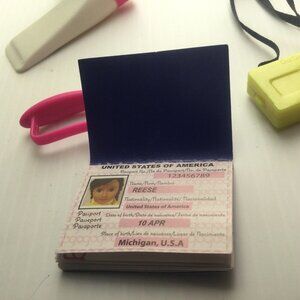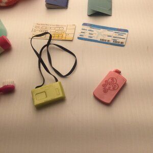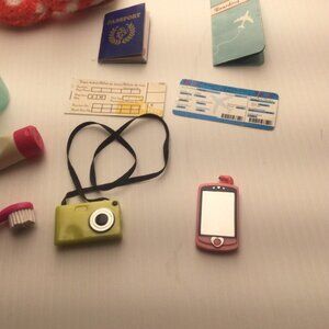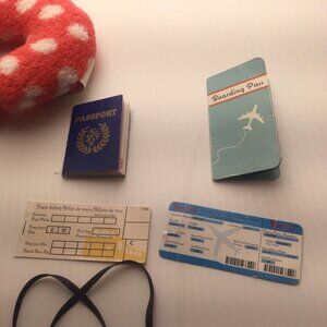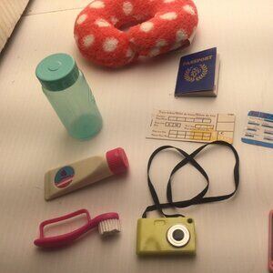 This 18" doll traveller set includes a passport, sun tan lotion, toothbrush, toothpaste, plane ticket, camera, cellphone, document sleeve, boarding pass, and neck pillow. It's the perfect accessory set for any doll that loves to travel. With everything she needs for a comfortable and fun trip, your doll will be able to explore the world with ease.