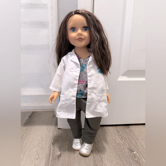 This adorable doctor doll wearing scrubs, silver flats and a white coat with long brown hair is perfect for imaginative play. Encourage your child's creativity and role-playing skills with this charming toy.