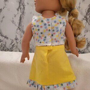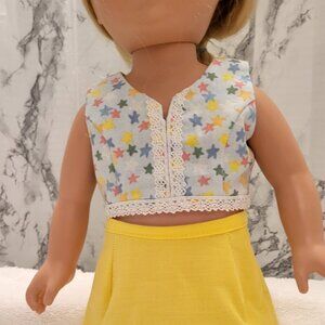 Bright as the sun, dress your doll in this bight yellow skirt with contrasting pleated edging (skirt designed by Lorie Mason) match the skirt with the Catalina top by Liberty Jane pattern found at Pixie Faire.com. Sewn in a smoke free home. DOLL NOT INCLUDED