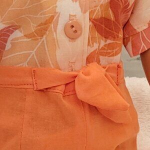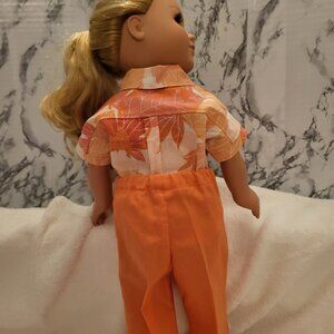 A lovely pair of casual peach colored Capri pants with fake front tie. Comes with matching front button shirt with collar and sleeves. You are truly ready for any casual occasion. Will Fit 18 inch dolls such as American Girl, My Life, and others. Sewn in a smoke free home. Doll not included