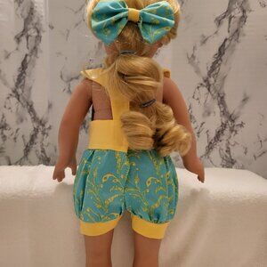 Ready for the warm sun. This two tone cotton romper ("The Lola Romper) is all you need for the hot summer days. Finish the look with a bow clip for the hair. Outfit sewn in a smoke free home. DOLL NOT INCLUDED.