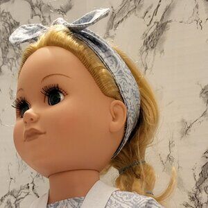 Jump into these light blue cotton short overalls with matching cotton top the perfect outfit for fun. You can also put the shirt overtop of the overalls for a different look. Finish off the look with a matching headband. Swen in a smoke free home. DOLL NOT INCLUDED