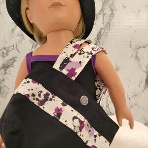 Beach time. Enjoy the beach in this 1 piece black swim suit with purple contrast by Liberty Jane found at Pixie Faire.com. Shade your dolls face with this reversable bucket hat by Carla C Dolly Designs. Fill up your matching bag with all your goodies for the beach. Sewn in a smoke free home. DOLL NOT INCLUDED