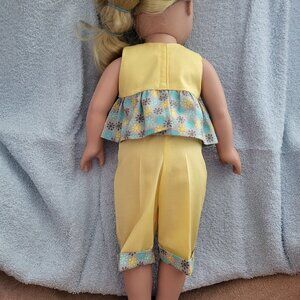 Ruffle top and capris this pattern comes from Love to dress up 18 inch doll clothing designed by Lorine Mason. This is sewn in contrasting cotton blends. This outfit sewn in a smoke free home. DOLL NOT INCLUDED.
