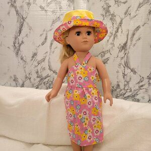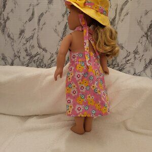 how about a pink print sun dress and hat. It too has a tie around the neck, the hat is a two tone finished of with a matching band and bow. Sewn in a smoke free home. Doll not included.