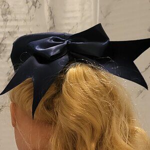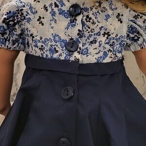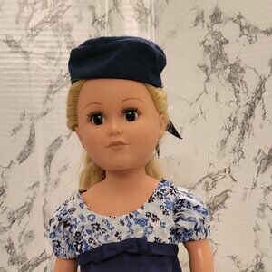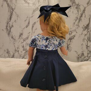With this fashionable dress and hat we are ready for a wedding or other formal event. The dress has a pretty bow in the front. Also the back of the dress has buttons all the way down to the hem let's not forget about that adorable hat with the fabulous Navy silk bow. The style does take you back in time. This lovely dress will fit most 18 inch dolls like American Girl, and My Life and others. This outfit was sewn in a smoke free home. Doll not included