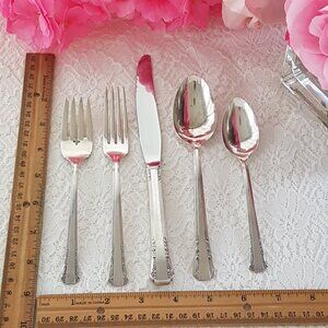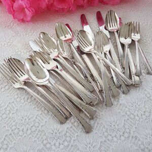 Vintage 1881 Rogers Oneida Del Mar 6-place settings. Each place setting includes one each of dinner fork, salad fork, dinner knife, soup spoon, teaspoon.