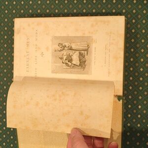 Victorian book about Good Men, intended to encourage the reader to Good Deeds. The spine is in good condition. It was sewn together. There is one spot front and back where the glue has cracked (see pictures).
