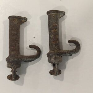 This pair of 1898 Maple tree 'Spiles' are for tapping Maple trees to collect the sap for making Maple Syrup. They are marked with “Pat’d” on one side and “1898” on the other. These are the really old ones - authentic cast steel (cast iron?) of unknown composition. They have a cross at the back where they are hammered into the hole that would have been pre drilled in the tree. There is a hollow channel for the sap to run down and a hook for the bucket to hang under the tap/spile.