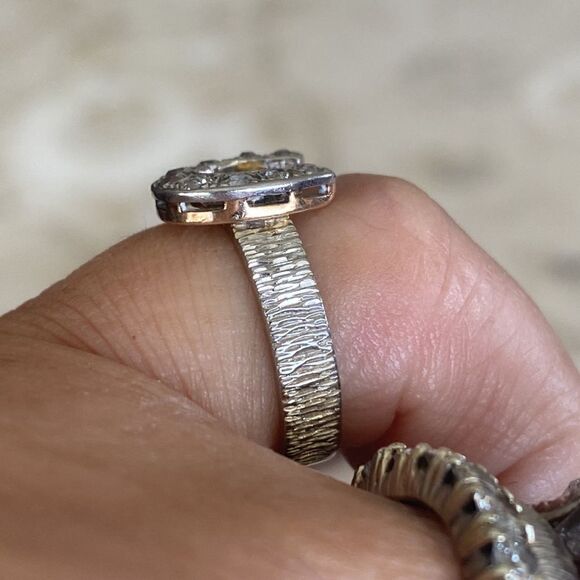 In excellent preowned condition gorgeous 18K white gold vintage custom made ring, features corse texture detail and horseshoe motif, bead set with 9 round old mine cut diamonds weighing approximately 0.45 carats in total.