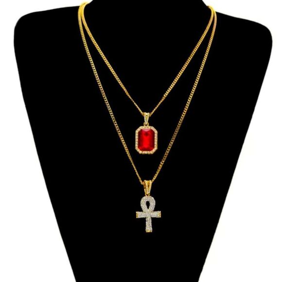 💝 18k Gold Necklaces with Red Ruby Gemstone and Iced Out Gold Cross Pendant