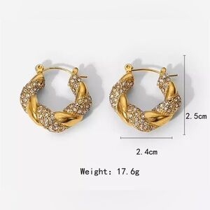 Beautiful twisted pavé hoop with several cubic zirconia stones. This statement piece is perfect to pair on it's own or with one of our huggie earrings.