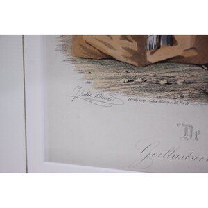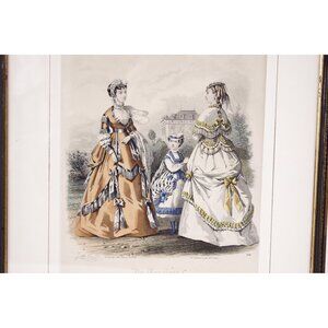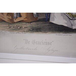 An elegant fashion illustration, partially hand coloured, professionally matted and framed. These are original engravings, not reproductions. Signed Jules David (left) dates ca 1860s, print number 896. The title: 'De Gracieuse' – 'Geillustreerde Aglaja' is the name of the magazine where this illustration was published (1862-1936; see below). In good condition with marks to the glass and frame, and a stain to the matt on the top right.