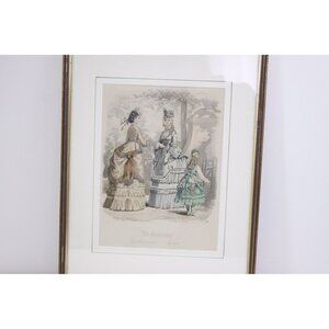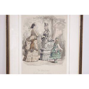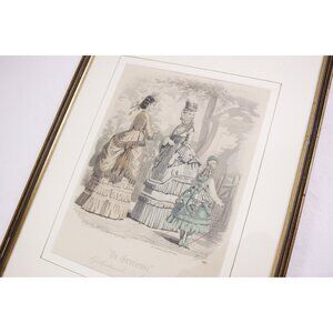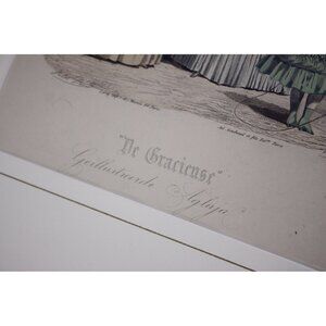 Size: 10.5 x 7-5/8 inches on the image, 16-3/4 x 12-3/4 inches on the frame. De Gracieuse manifested itself from 1862 until 1936 as an attractive fashion and handicraft magazine targeting a growing audience of fashion-conscious ladies. The fashion examples were usually inspired by the newest fashion in Paris. The displayed patterns were suitable for all hours and occasions of the day. They varied from simple garments to gorgeous evening gowns and from undergarments to travel clothing or sports attire. Male fashion was hardly mentioned in the magazine. Children’s clothing was discussed in special articles. Prints such as these form part of the print collection of the world famous Rijksmuseum in Amsterdam. This is your chance to own your own copy!