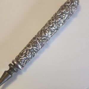 The highly ornate, floral-patterned handle is a key feature. This kind of intricate, decorative design is very common on Victorian or Edwardian era silverware, where a wide array of specialized serving pieces was a sign of wealth and proper etiquette. The material is likely sterling silver or silver-plated metal, given the level of detail and the style of the handle.