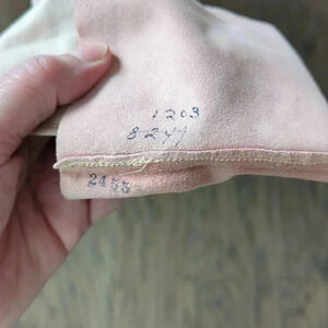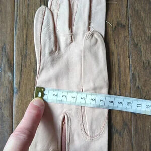 These probably date from the 1920's and were my Grandmother's gloves. These gloves are made of the softest , most buttery feeling thin leather! They are in fantastic condition with only one tiny spot on a finger and a couple spots high up on one side. They are very small, probably size 6 3/4. The colour is a pale blush.