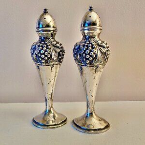 1920s vintage silver electroplated art deco grape design salt and pepper shakers. Polished with a patina typical of age and stunning! Contains lead so not for actual food serving use but they look fabulous as table accents. Measure about 5 inches tall. Cat friendly, nonsmoking home.