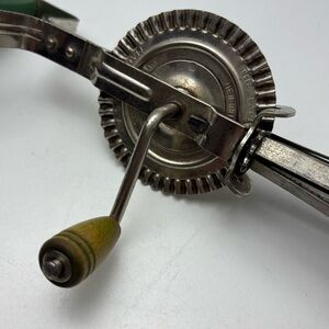 1920s hand crank egg beater from Taplin Mfg Co, Pat no. 1518285. This nifty antique kitchen tool still works great! It features an attractive green handle and crank (the crank paint has mostly worn off over time). This simple, hand-powered design is still the quickest and easiest way to beat your eggs.