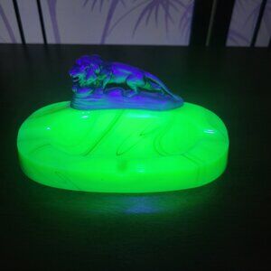1930s Houze Akro Agate Slag Glass UV Radium Glow Art Deco Brass Lion Ashtray
